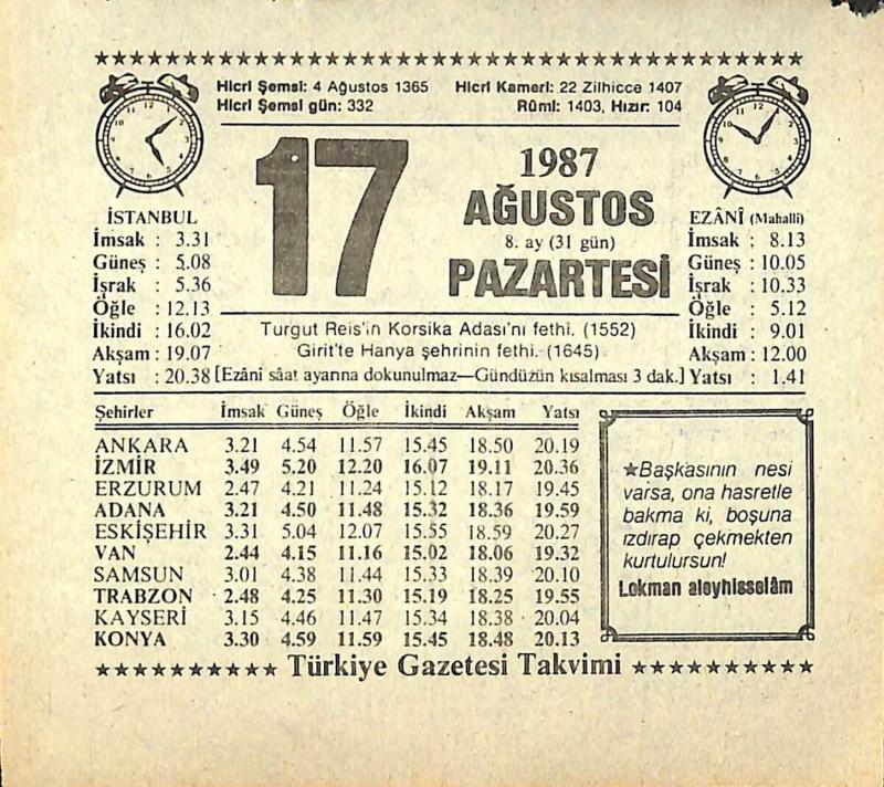 17 Ağustos 1987 Takvim Yaprağı - Doğum Günü Hediyesi EFMN13860, en son 21 gün önce güncellenmiştir.