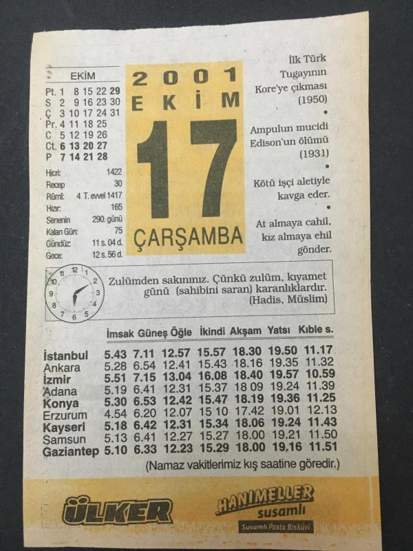 17 EKİM 2001-TAKVİM YAPRAĞI-DOĞUM GÜNÜ HEDİYESİ-ÜLKER TAKVİMİ,İLK TÜRK TUGAYININ KOREYE ÇIKMASI 1950,EDİSONUN ÖLÜMÜ 1931,İBRAHİM ÇALLI 1882-1960 başlıklı ürün, Efemera, Müzik, Sinema > Belge ve Evraklar > Takvimler kategorisi altında İkinci El olarak satılmaktadır.