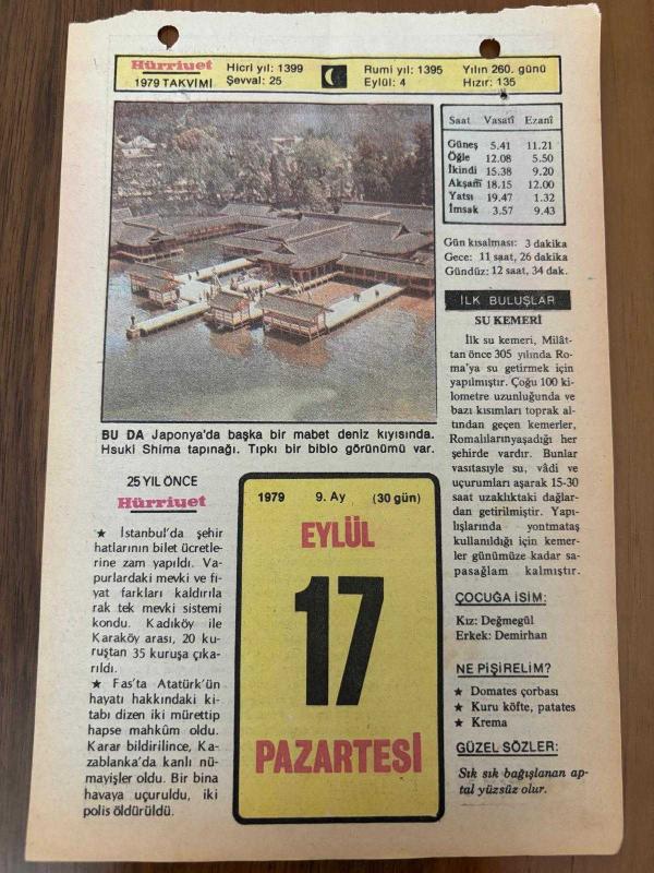 17 EYLÜL 1979 - TAKVİM YAPRAĞI - DOĞUM GÜNÜ HEDİYESİ - HÜRRİYET TAKVİMİ - PİS BİR İŞ ROMANI - Bandırma'nın Kurtuluş Günü" - Burdur'da sergi - Rize'de"Çay Festivali" - Kayseri Sivas maçında kanlı olaylar 40 ölü 300 yaralı (1967) - Adnan Menderes'in idamı (1961), en son 8 ay önce güncellenmiştir.