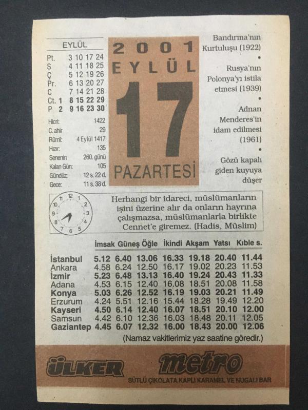 17 EYLÜL 2001-TAKVİM YAPRAĞI-DOĞUM GÜNÜ HEDİYESİ-ÜLKER TAKVİMİ,BANDIRMANIN KURTULUŞU,1922,RUSYANIN POLANYAYI İSTİLA ETMESİ,1939,ADNAN MENDERESİN İDAM EDİLMESİ,1961,KIZINIZIN SAÇLARI