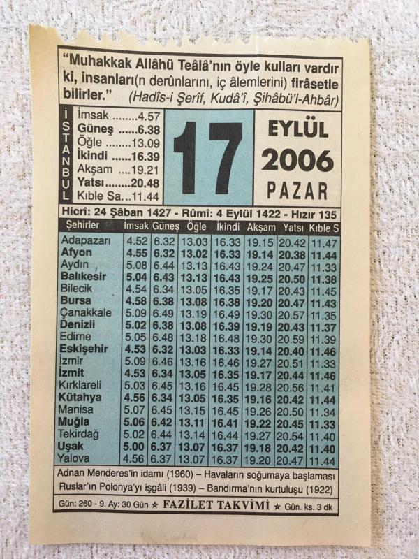 17 EYLÜL 2006-TAKVİM YAPRAĞI-DOĞUM GÜNÜ HEDİYESİ-FAZİLET TAKVİMİ, 1 yıl önce satışa sunulmuştur.