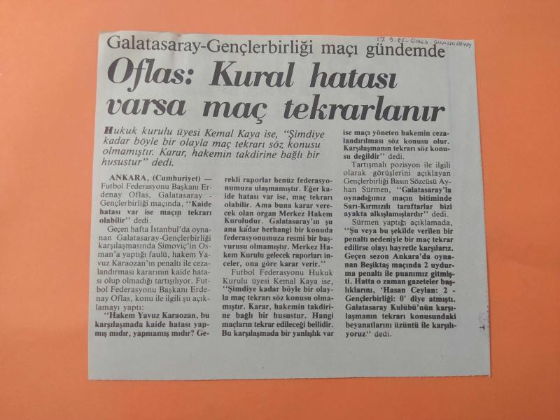 Kitap 1986 yılında yayınlanmıştır. 17 Eylül 1986 - Cumhuriyet Gazetesi - Galatasaray - Gençlerbirliği maçı gündemde - Oflas: Kural hatası varsa maç tekrarlanır - Hukuk kurulu üyesi Kemal Kaya ise ''Şimdiye kadar böyle bir olayla maç tekrarı söz konusu olmamıştır'' dedi - Gazete tam değil kupürüdür - 16x14cm ebatındadır.. adlı eser Türkçe dilindedir.