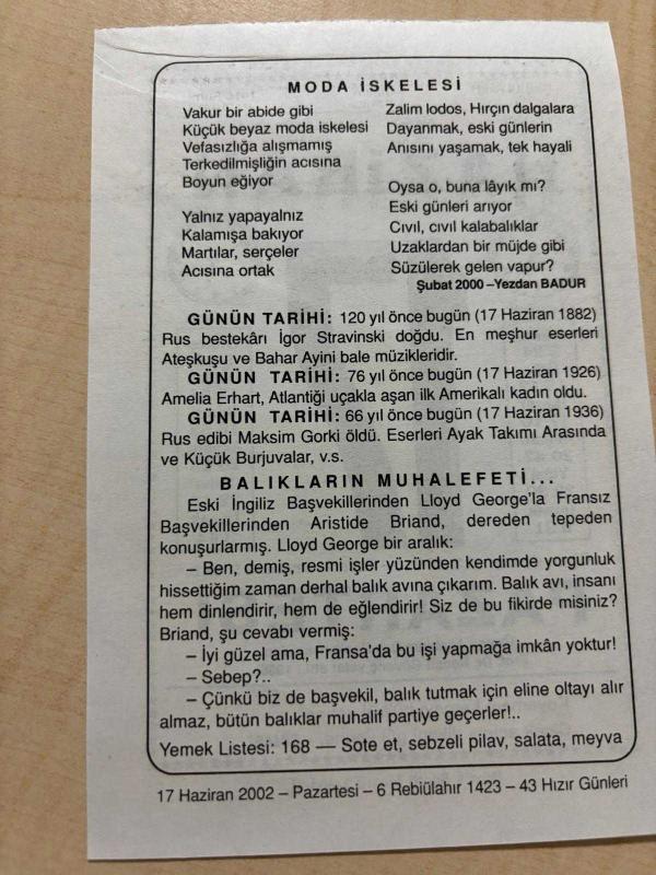 17 HAZİRAN 2002 - TAKVİM YAPRAĞI - DOĞUM GÜNÜ HEDİYESİ - BÜYÜK SAATLİ MAARİF TAKVİMİ - ŞİNASİ - YEZDAN BADUR - RUS BESTEKARI İGOR STRAVİNSKİ DOĞDU - AMELİA ERHART ATLANTİĞİ UÇAKLA AŞAN İLK KADIN PİLOT - RUS YAZAR MAKSİM GORKİ'NİN VEFATI - BALIKLARIN MUHALEFETİ ADLI YAZI başlıklı ürün, Efemera, Müzik, Sinema > Belge ve Evraklar > Takvimler kategorisi altında İkinci El olarak satılmaktadır.