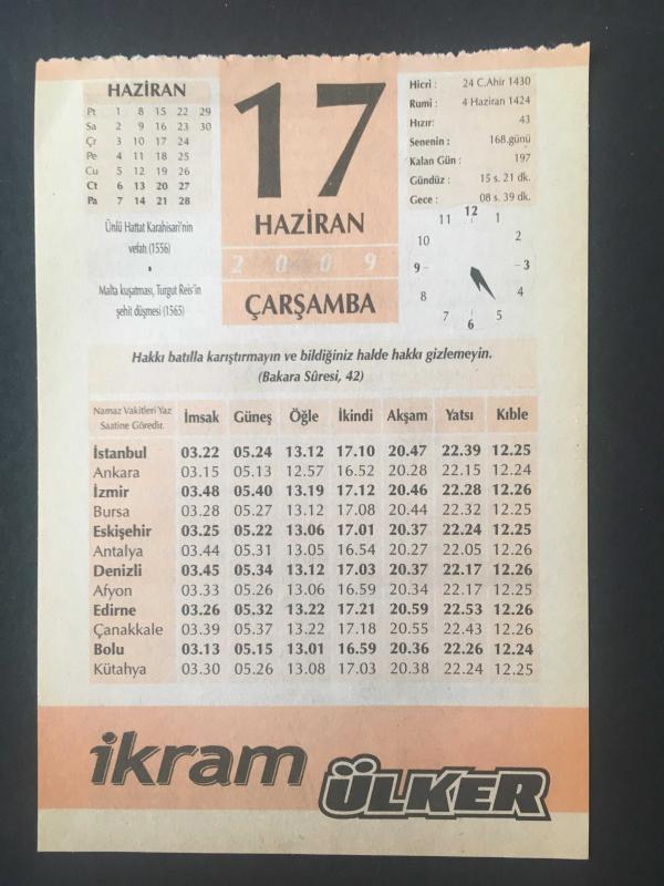 17 HAZİRAN 2009 -TAKVİM YAPRAĞI-DOĞUM GÜNÜ HEDİYESİ-ÜLKER TAKVİMİ,ÜNLÜ HATTAT KARAHİSARİNİN VEFATI,1556,MALTA KUŞATMASI TURGUT REİSİN ŞEHİD DÜŞMESİ 1565,BURUN KANARSA,ÇOCUĞUNUZUN İSMİ,GEÇE DOĞAN GÜNEŞ NEREDE GÖRÜLÜR,KABAK KÖFTESİ başlıklı ürün, Efemera, Müzik, Sinema > Belge ve Evraklar > Takvimler kategorisi altında İkinci El olarak satılmaktadır.