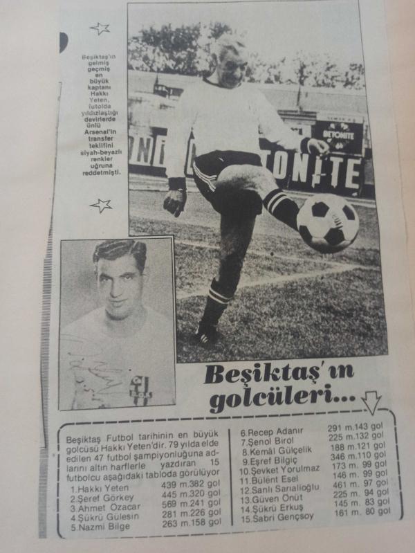 17 Haziran 1982 - Beşiktaş'ın golcüleri - Beşiktaş'ın gelmiş geçmiş en büyük kaptanı Hakkı Yeten, futbolda yıldızlaştığı devirlerde ünlü Arsenal'in transfer teklifini Beşiktaş için reddetmişti Gazete haberi - Tek Yaprak Arkalı Önlüdür adlı eser, Kitap > Süreli Yayınlar > Dergiler > Spor kategorisinde İkinci El olarak satıştadır.