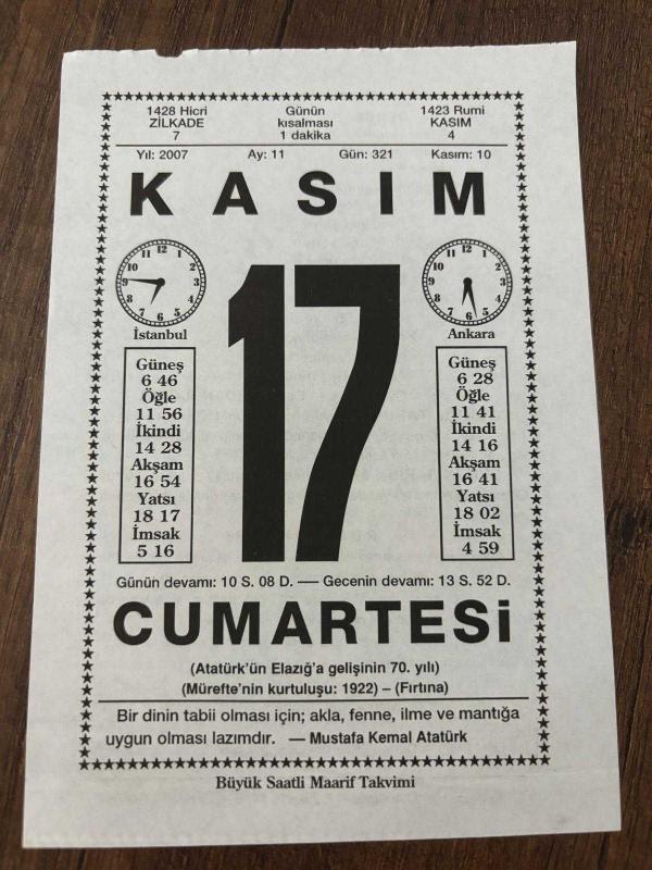 17 KASIM 2007 - TAKVİM YAPRAĞI - DOĞUM GÜNÜ HEDİYESİ - BÜYÜK SAATLİ MAARİF TAKVİMİ - MUSTAFA KEMAL ATATÜRK - ECZ.YEZDAN BADUR - FRANSIZ HEYKELTRAŞ RODİN ÖLDÜ - OSMANLI HÜKÜMDARI VAHDETTİN İNGİLİZ SAVAŞ GEMİSİ İLE ÜLKEDEN AYRILDI, en son 8 ay önce güncellenmiştir.