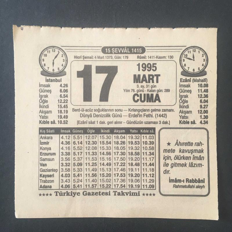 17 MART 1995 -TAKVİM YAPRAĞI-DOĞUM GÜNÜ HEDİYESİ-TÜRKİYE GAZETESİ TAKVİMİ,BERD ÜL ACUZ SOĞUKLARININ SONU,KIRLANGIÇLARIN GELME ZAMANI,DÜNYA DENİZCİLİK GÜNÜ,ERDELİN FETHİ 1442,OKUNACAK DUALAR,LÜTFEN, en son 8 ay önce güncellenmiştir.