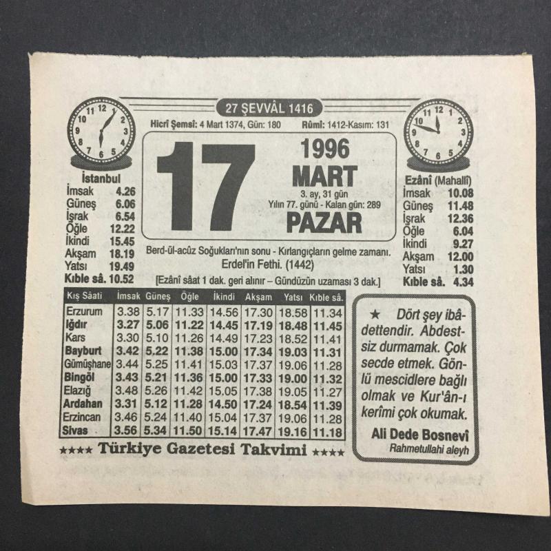 17 MART 1996 -TAKVİM YAPRAĞI-DOĞUM GÜNÜ HEDİYESİ-TÜRKİYE GAZETESİ TAKVİMİ,BERDÜL ACUZ SOĞUKLARININ SONU,KIRLANGIÇLARIN GELME ZAMANI,ERDELİN FETHİ 1442,YAŞLILIK HÜZÜNLERİ,NASIL BİLMİŞ, en son 8 ay önce güncellenmiştir.