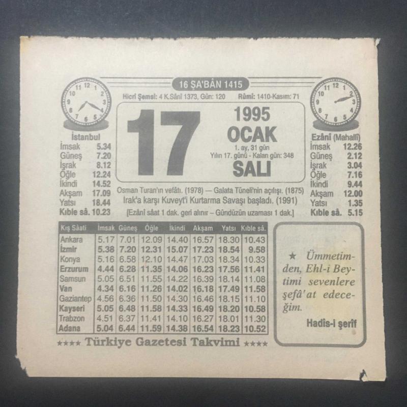 17 OCAK 1995 -TAKVİM YAPRAĞI-DOĞUM GÜNÜ HEDİYESİ-TÜRKİYE GAZETESİ TAKVİMİ,OSMAN TURAN IN VEFATI 1978,GALATA TÜNELİNİN AÇILIŞI,1875,IRAKA KARŞI KUVEYTİ KURTARMA SAVAŞI BAŞLADI 1991,KORKU VE SEVGİ, 11 ay önce satışa sunulmuştur.