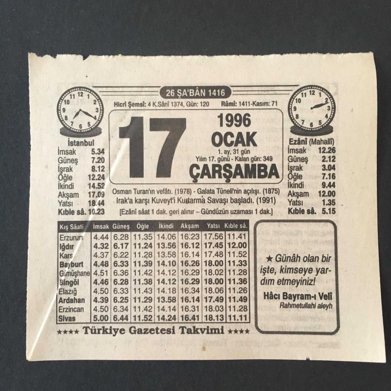 17 OCAK 1996-TAKVİM YAPRAĞI-DOĞUM GÜNÜ HEDİYESİ-TÜRKİYE GAZETESİ TAKVİMİ,OSMAN TURANIN VEFATI 1978,GALATA TÜNELİNİN AÇILIŞI,1875,IRAKA KARŞI KUVEYTİ KURTARMA SAVAŞI BAŞLADI 1991,RESULULLAHIN İZNİ,ZEYTİNYAĞLI BARBUNYA