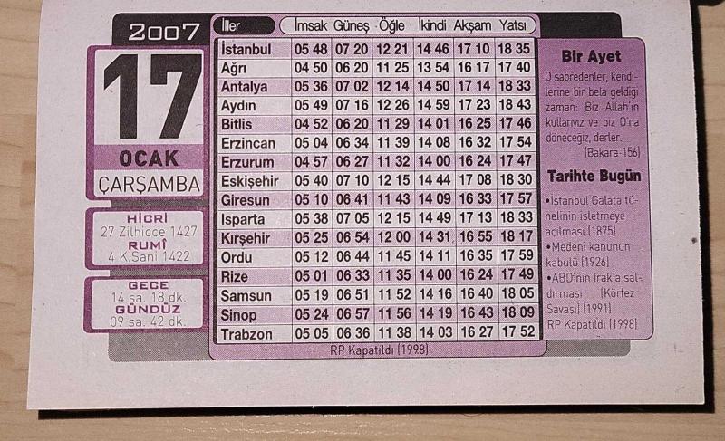 17 OCAK 2007 ÇARŞAMBA - TAKVİM YAPRAĞI - DOĞUM GÜNÜ HEDİYESİ - TÜRMATSAN TAKVİMİ - İSTANBUL GALATA TÜNELİNİN İŞLETMEYE AÇILMASI (1875)- MEDENİ KANUNUN KABULÜ (1926)- ABD'NİN IRAK'A SALDIRMASI (KÖRFEZ SAVAŞI) (1991)- RP KAPATILDI (1998)-BENİ KİM DÖVÜYOR-BİLETİMİ YIRTIYOR- HEP NEFS, 9 gün önce satışa sunulmuştur.