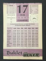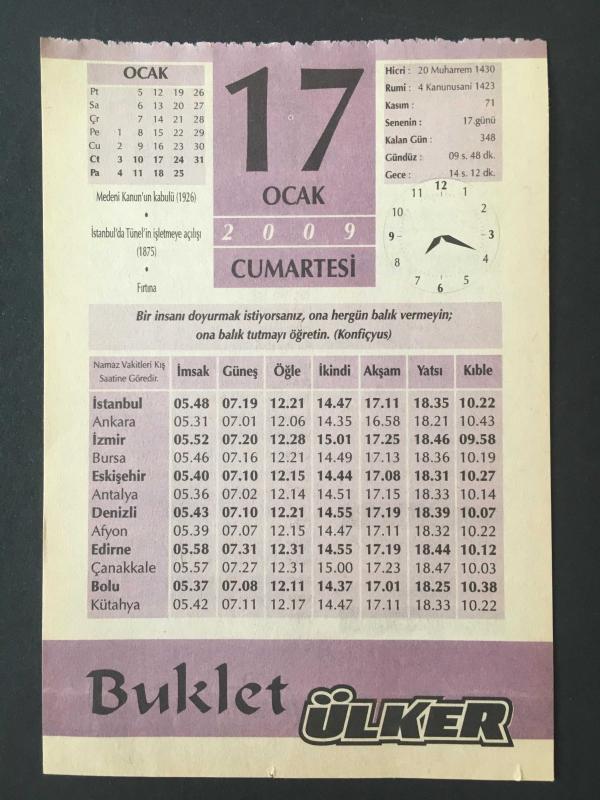 17 OCAK 2009 -TAKVİM YAPRAĞI-DOĞUM GÜNÜ HEDİYESİ-ÜLKER TAKVİMİ,MEDENİ KANUNUNUN KABULÜ 1926,İSTANBULDA TÜNELİN İŞLETMEYE AÇILIŞI 1875,FIRTINA,BİLİYORMUSUNUZ,ARI SOKMASI,GÜNÜN MENÜSÜ,ÇOCUĞUNUZUN İSMİ,NOHUTLU DANA YAHNİSİ başlıklı ürün, Efemera, Müzik, Sinema > Belge ve Evraklar > Takvimler kategorisi altında İkinci El olarak satılmaktadır.
