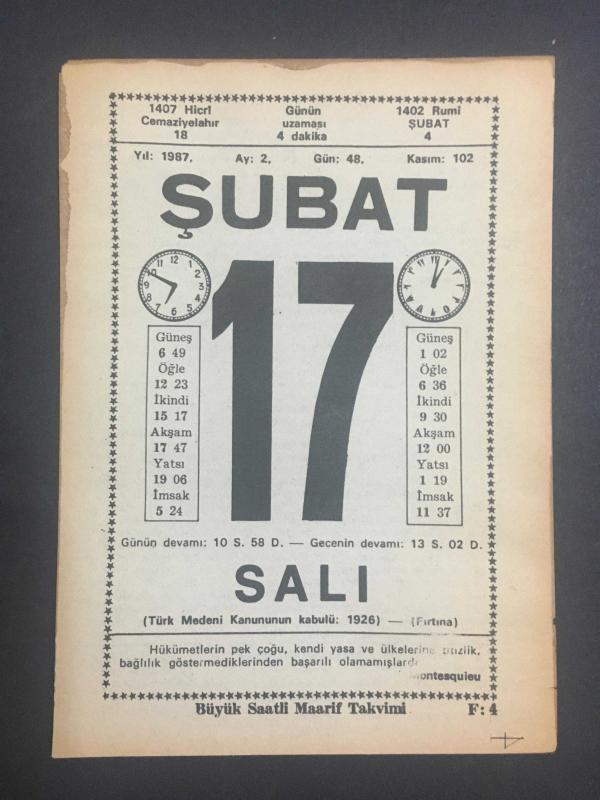 17 ŞUBAT 1987 -TAKVİM YAPRAĞI-DOĞUM GÜNÜ HEDİYESİ-BÜYÜK SAATLİ MAARİF TAKVİMİ,TÜRK MEDİNİ KANUNUN KABULÜ 1926,İNSAN KÖTÜ DOĞMAZ,İYİ ADAM KİMDİR,GÜNLERİMİZ OLACAK,LÜTFİ KIRDAR 17 ŞUBAT 1961 DE VAFAT ETTİ,MUTLULUK ÇIKMAZINDAN PARÇALAR, 1 yıl önce satışa sunulmuştur.