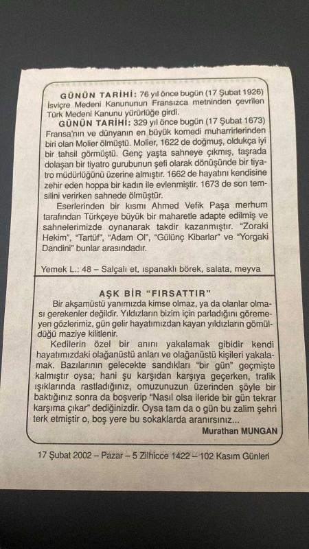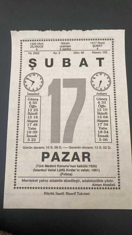 17 ŞUBAT 2002 - TAKVİM YAPRAĞI - DOĞUM GÜNÜ HEDİYESİ - BÜYÜK SAATLİ MAARİF TAKVİMİ - ALMAN ATASÖZÜ - TÜRK MEDENİ KANUNU'NUN YÜRÜLÜĞE GİRMESİ - MOLİER'İN VEFATI - AŞK BİR FIRSATTIR ADLI KISA YAZI, en son 8 ay önce güncellenmiştir.