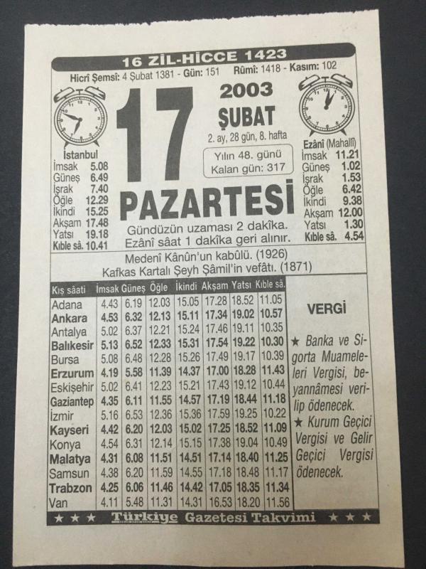 17 ŞUBAT 2003-TAKVİM YAPRAĞI-DOĞUM GÜNÜ HEDİYESİ-TÜRKİYE GAZETESİ TAKVİMİ,MEDENİ KANUNUN KABULÜ,1926,ŞEY ŞAMİLİN VEFATI 1871,GARİP BİR KOŞU başlıklı ürün, Efemera, Müzik, Sinema > Belge ve Evraklar > Takvimler kategorisi altında İkinci El olarak satılmaktadır.