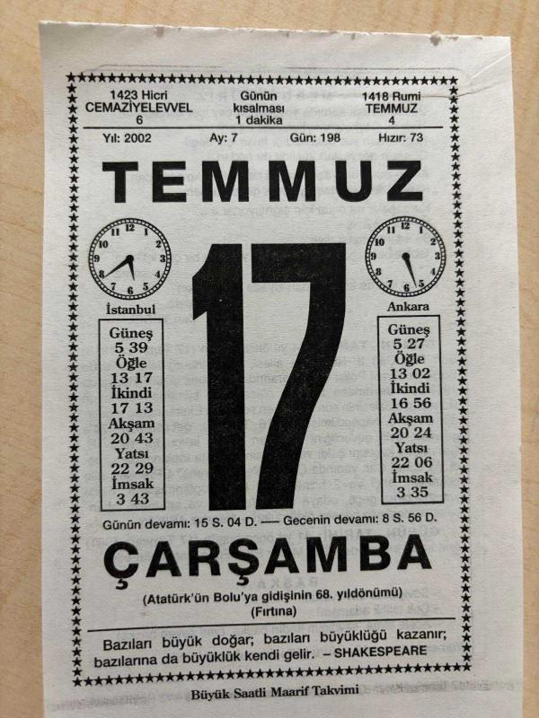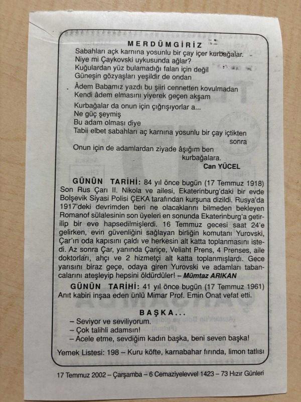 17 TEMMUZ 2002 - TAKVİM YAPRAĞI - DOĞUM GÜNÜ HEDİYESİ - BÜYÜK SAATLİ MAARİF TAKVİMİ - SHAKESPEARE - CAN YÜCEL - ÇAR II.NİKOLA, ÇARİÇE, VELİAHT PRENS, 4 PRENSES VE HİZMETKARLARI ÖLDÜRÜLDÜLER - ANIT KABİRİ İNŞAA EDEN ÜNLÜ MİMAR PROF.EMİN ONAT VEFAT ETTİ - BAŞKA ADLI YAZI, en son 8 ay önce güncellenmiştir.