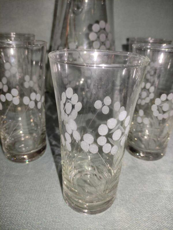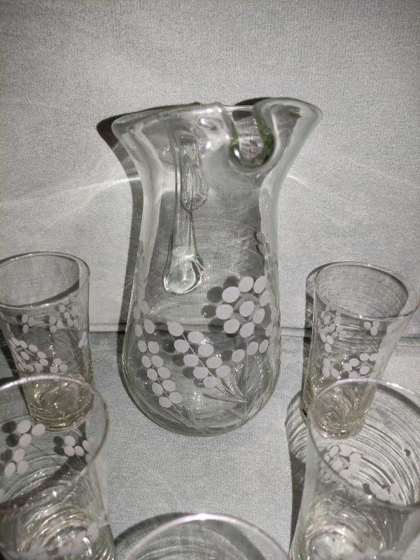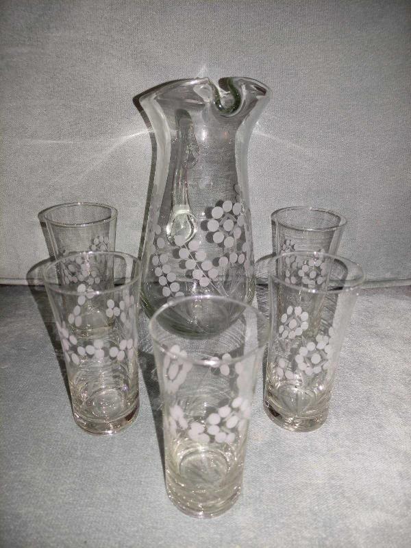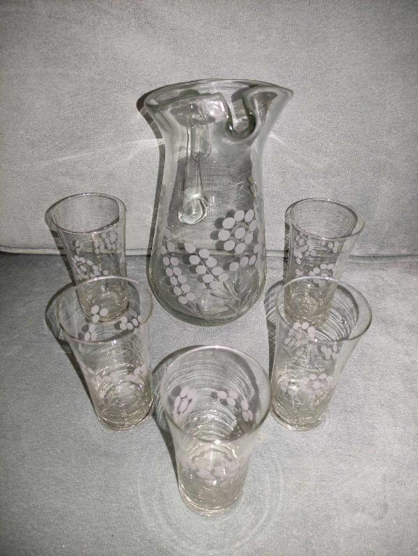 17101-80 Lİ YILLARA AİT ÇOK ŞAHANE CAM SÜRAHİ VE 5 ADET LİMONATA BARDAĞI SÜRAHİ ÇAPI 11 CM YÜK 22 CM BARDAK ÇAPI 7 CM YÜK 13 CM