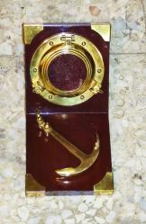17265-GEMİ SÖKÜMDEN ÇIKMA AHŞAP ÜZERİNDE PİRİNÇ LUMBOZ+GEMİCİ ÇAPASI MASA ÜZTÜ OBJESİ