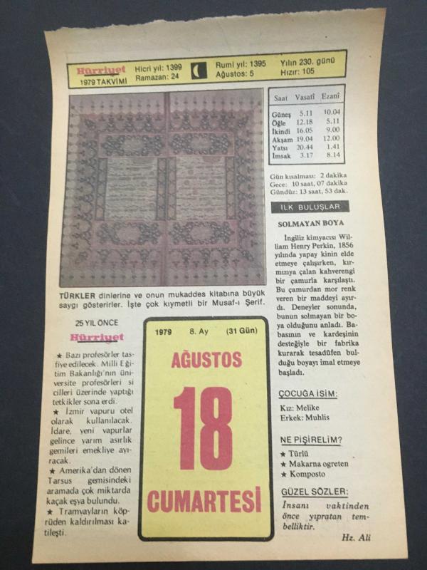 18 AĞUSTOS 1979-TAKVİM YAPRAĞI-DOĞUM GÜNÜ HEDİYESİ-HÜRRİYET TAKVİMİ,ÇOCUĞA İSİM,DİNİ SOHBET TEVAZU,KONYA EREĞLİSİNDE ELMA ŞENLİĞİ,TÜRK DENİZALTICILIĞININ 90.YILI,CENGİZ HANIN ÖLÜMÜ 1227, en son 8 ay önce güncellenmiştir.