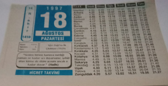 18 Ağustos 1997-Orijinal Takvim Yaprağı-Doğum Günü-Söz,Nişan,Nikâh,Düğün ve Önemli Günler Hediyesi-Hicret Takvimi-Ayet(Hadis)-(Hadis)-Ağrı Dağı'na İlk Çıkılması(1829)-Abdulkadir Geylani-Bir Mesele-Henri Pestalozzi, en son 3 gün önce güncellenmiştir.