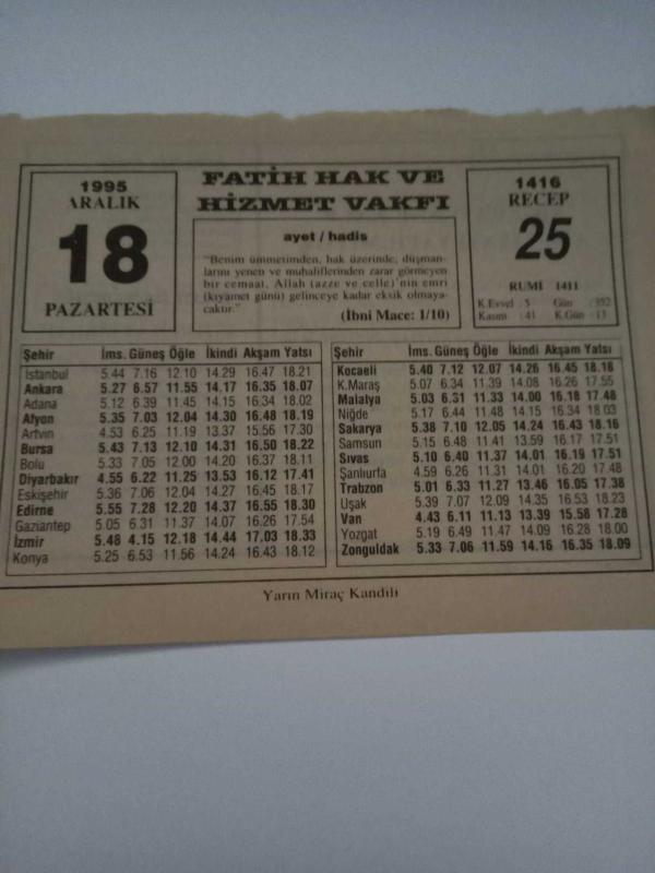 18 Aralık 1995-Orijinal Takvim Yaprağı-Doğum Günü-Söz,Nişan,Nikâh,Düğün ve Önemli Günler Hediyesi-Fatih Hak ve Hizmet Vakfı-Ayet/Hadis(İbni Mace:1/10)-Sigara İçene Kalp Ameliyatı Yapılmıyor-Sözün Özü-Astımlılar Dikkat!, en son 4 ay önce güncellenmiştir.