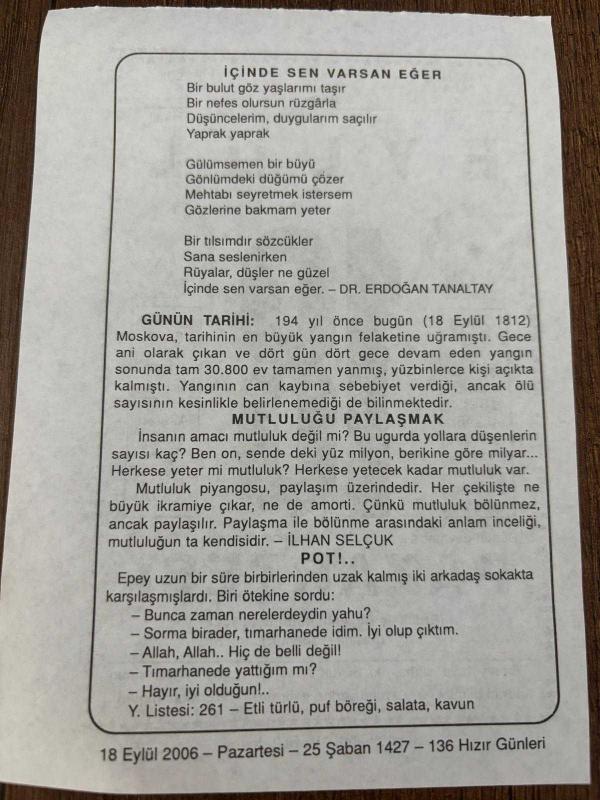18 EYLÜL 2006 - TAKVİM YAPRAĞI - DOĞUM GÜNÜ HEDİYESİ - BÜYÜK SAATLİ MAARİF TAKVİMİ - HZ.MUHAMMED - DR.ERDOĞAN TANALTAY - İLHAN SELÇUK - BÜYÜK MOSKOVA YANGINI başlıklı ürün, Efemera, Müzik, Sinema > Belge ve Evraklar > Takvimler kategorisi altında İkinci El olarak satılmaktadır.