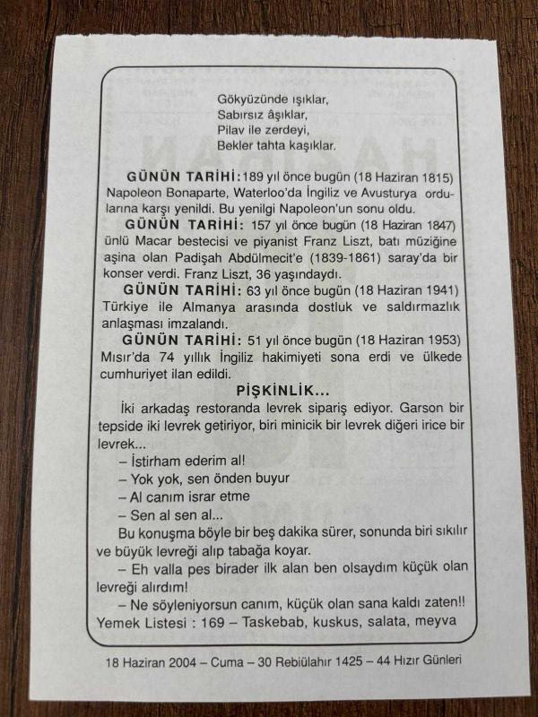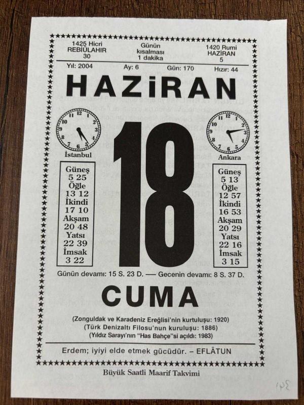 18 HAZİRAN 2004 - TAKVİM YAPRAĞI - DOĞUM GÜNÜ HEDİYESİ - BÜYÜK SAATLİ MAARİF TAKVİMİ - EFLATUN - NAPOLEON İNGİLİZ ORDULARINA YENİLDİ - TÜRKİYE İLE ALMANYA ARASINDA DOSTLUK ANLAŞMASI YAPILDI - MISIR'DA CUMHURİYET İLAN EDİLDİ - PİŞKİNLİK, en son 8 ay önce güncellenmiştir.