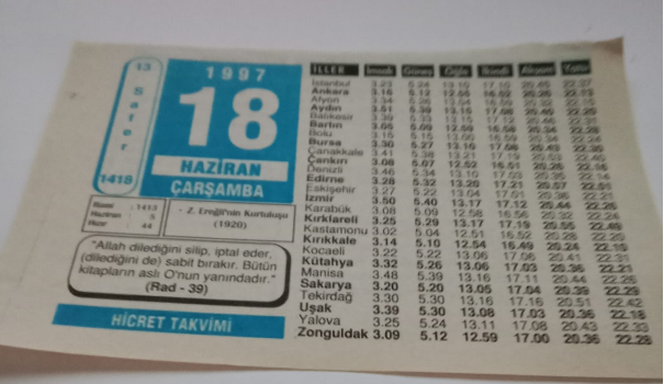 18 Haziran 1997-Orijinal Takvim Yaprağı-Doğum Günü-Söz,Nişan,Nikâh,Düğün ve Önemli Günler Hediyesi-Hicret Takvimi-Ayet(Hadis)-(Rad-39)-Z.Ereğli'nin-Kurtuluşu(1920)Hezeyfe-i Yemani(r.a.)-Örtü Adına, en son 21 gün önce güncellenmiştir.