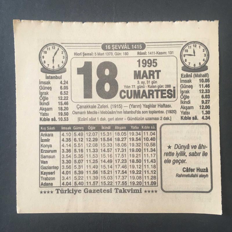 18 MART 1995 -TAKVİM YAPRAĞI-DOĞUM GÜNÜ HEDİYESİ-TÜRKİYE GAZETESİ TAKVİMİ,ÇANAKKAE ZAFERİ,1915,OSMANLI MECLİSİ MEBUSANIN İSTANBULDA SON TOPLANTISI 1920,NİLÜFER ÇİÇEĞİ başlıklı ürün, Efemera, Müzik, Sinema > Belge ve Evraklar > Takvimler kategorisi altında İkinci El olarak satılmaktadır.