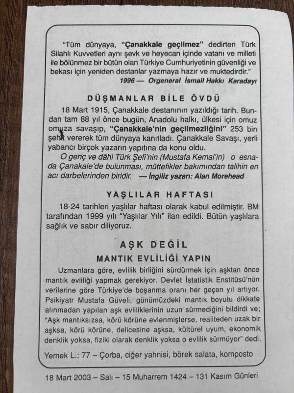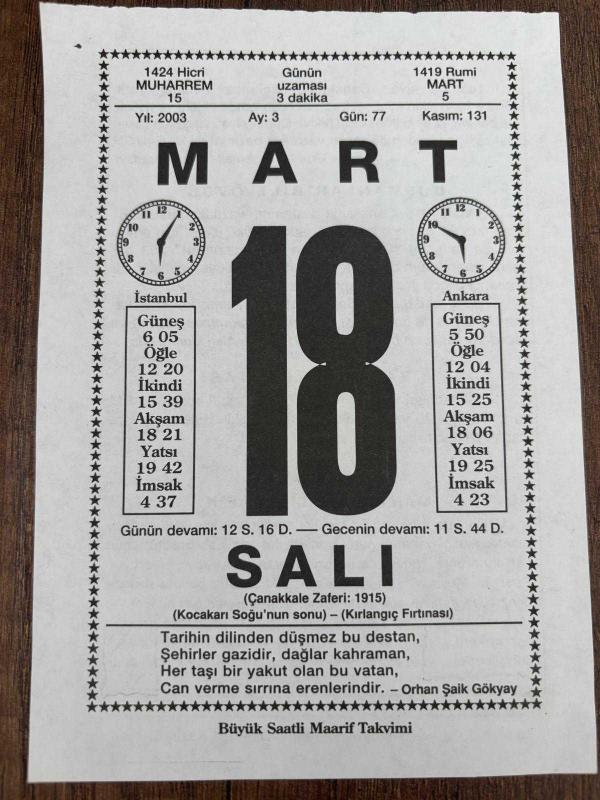 18 MART 2003 - TAKVİM YAPRAĞI - DOĞUM GÜNÜ HEDİYESİ - BÜYÜK SAATLİ MAARİF TAKVİMİ - ORHAN ŞAİK GÖKYAY - ORGENERAL İSMAİL HAKKI KARADAYI - ALAN MOLAHEAD - YAŞLILAR HAFTASI - AŞK DEĞİL MANTIK EVLİLİĞİ YAPIN, en son 8 ay önce güncellenmiştir.