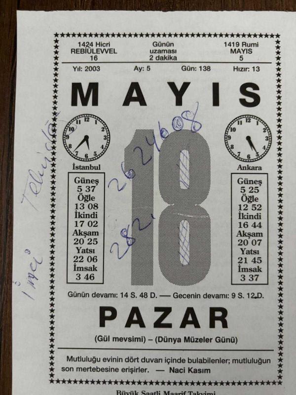 18 MAYIS 2003 - TAKVİM YAPRAĞI - DOĞUM GÜNÜ HEDİYESİ - BÜYÜK SAATLİ MAARİF TAKVİMİ - NACİ KASIM - GÜLTEKİN SAMANOĞLU - DÜNYA MÜZELER GÜNÜ VE HAFTASI - NE DERSİNİZ, en son 8 ay önce güncellenmiştir.