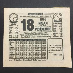 18 NİSAN 1996-TAKVİM YAPRAĞI-DOĞUM GÜNÜ HEDİYESİ-TÜRKİYE GAZETESİ TAKVİMİ,TÜRK YUNAN HARBİNİN BAŞLAMASI ,1897,ADANA KARACAOĞLANI ANMA GÜNÜ ,İHLAS VAKTİ,TÜRK YUNAN SAVAŞI