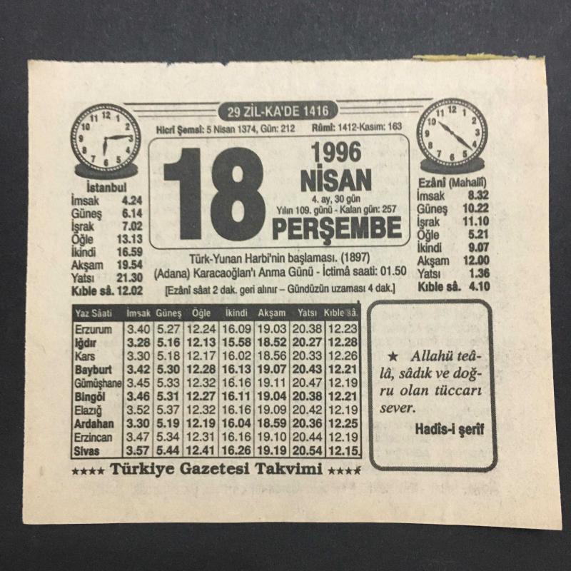 18 NİSAN 1996-TAKVİM YAPRAĞI-DOĞUM GÜNÜ HEDİYESİ-TÜRKİYE GAZETESİ TAKVİMİ,TÜRK YUNAN HARBİNİN BAŞLAMASI ,1897,ADANA KARACAOĞLANI ANMA GÜNÜ ,İHLAS VAKTİ,TÜRK YUNAN SAVAŞI başlıklı ürün, Efemera, Müzik, Sinema > Belge ve Evraklar > Takvimler kategorisi altında İkinci El olarak satılmaktadır.