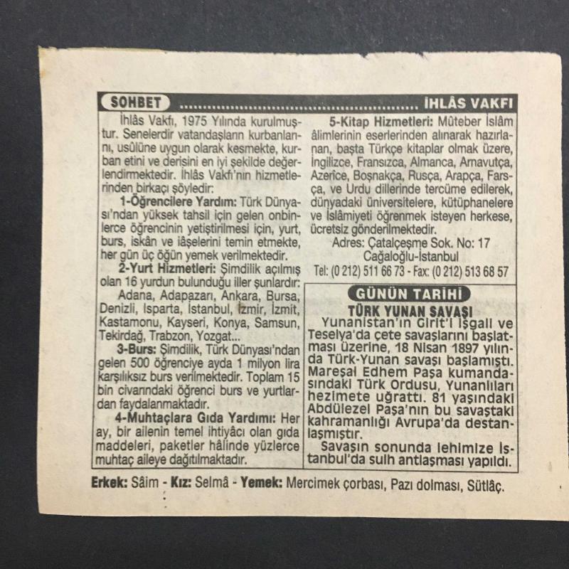 18 NİSAN 1996-TAKVİM YAPRAĞI-DOĞUM GÜNÜ HEDİYESİ-TÜRKİYE GAZETESİ TAKVİMİ,TÜRK YUNAN HARBİNİN BAŞLAMASI ,1897,ADANA KARACAOĞLANI ANMA GÜNÜ ,İHLAS VAKTİ,TÜRK YUNAN SAVAŞI, en son 8 ay önce güncellenmiştir.