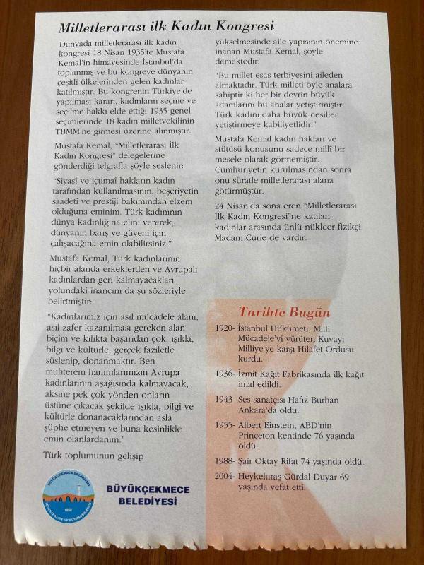 18 NİSAN 2008 - TAKVİM YAPRAĞI - DOĞUM GÜNÜ HEDİYESİ - GAZİ MUSTAFA KEMAL ATATÜRK FOTOĞRAFLI BÜYÜKÇEKMECE BELEDİYESİ TAKVİMİ - Milletlerarası ilk Kadın Kongresi - Milletlerarası ilk Kadın Kongresi 1920- İstanbul Hükümeti, Milli Mücadele'yi yürüten Kuvayı Milliye'ye karşı Hilafet Ordusu kurdu - 1936- İzmit Kağıt Fabrikasında ilk kağıt imal edildi - 1943- Ses sanatçısı Hafız Burhan Ankara'da öldü - 1955- Albert Einstein, ABD'nin Princeton kentinde 76 yaşında öldü - 1988- Şair Oktay Rifat 74 yaşında öldü - 2004- Heykeltıraş Gürdal Duyar 69 yaşında vefat etti, en son 9 ay önce güncellenmiştir.