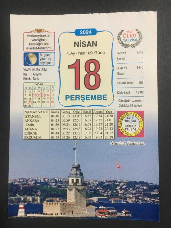 18 NİSAN 2024 -TAKVİM YAPRAĞI-DOĞUM GÜNÜ HEDİYESİ-VASIF ÜLKÜ TAKVİMİ,İSTANBUL KIZ KULESİ,YAVRUNUZA İSİM,EDİP AKBAYRAM,ANADOLU HİYEROGLİFLERİ,AĞIRLIK,BEN ÖLÜRSEM DEN, en son 8 ay önce güncellenmiştir.