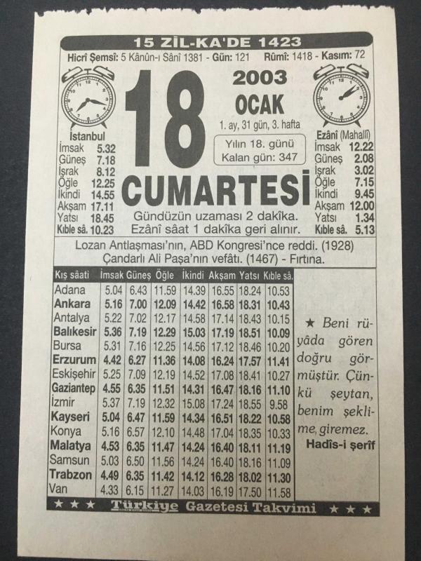 18 OCAK 2003-TAKVİM YAPRAĞI-DOĞUM GÜNÜ HEDİYESİ-TÜRKİYE GAZETESİ TAKVİMİ,LOZAN ANLAŞMASININ ABD KONGRESİNCE REDDİ1928,ÇANDARLI ALİ PAŞANIN VEFATI 1467 SIFIRI KİM BULDU, 1 yıl önce satışa sunulmuştur.