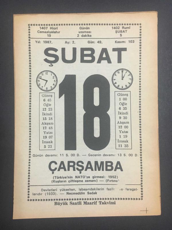 18 ŞUBAT 1987 -TAKVİM YAPRAĞI-DOĞUM GÜNÜ HEDİYESİ-BÜYÜK SAATLİ MAARİF TAKVİMİ,TÜRKİYENİN NATOYA GİRMESİ 1952,KUŞLARIN ÇİFTLEŞME ZAMANI,ENFLASYON NEDİR,ÇARE,OLMAZ DUA,MUTLULUK ÇIKMAZINDAN PARÇALAR