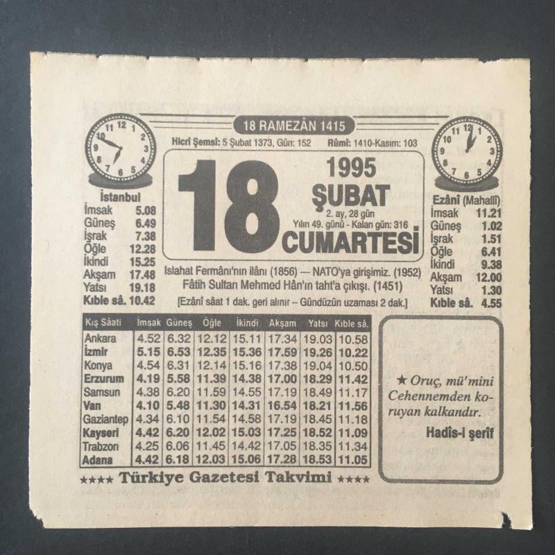 18 ŞUBAT 1995 -TAKVİM YAPRAĞI-DOĞUM GÜNÜ HEDİYESİ-TÜRKİYE GAZETESİ TAKVİMİ,İSLAHAT FERMENININ İLANI 1856,NATOYA GİRİŞİMİZ,1952,FATİHİN TAHTA ÇIKIŞI 1451,BAC,ÇEŞMELER,TÜKENMEZ KALEM LEKESİ, 11 ay önce satışa sunulmuştur.