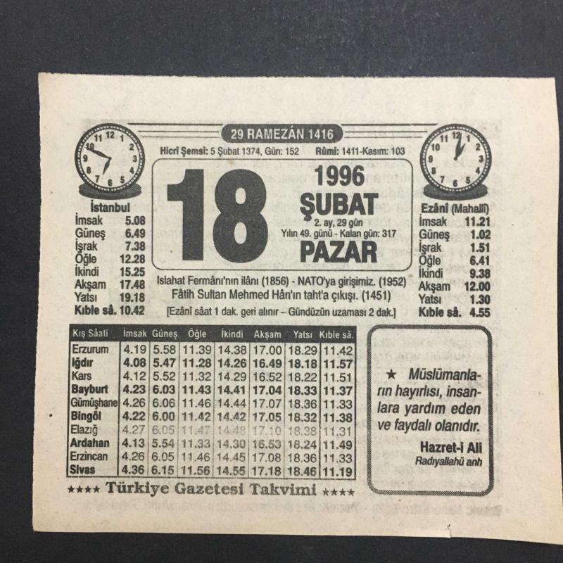 18 ŞUBAT 1996 -TAKVİM YAPRAĞI-DOĞUM GÜNÜ HEDİYESİ-TÜRKİYE GAZETESİ TAKVİMİ,ISLAHAT FERMANIN IN İLANI 1856,NATOYA GİRİŞİMİZ,1952,FATİHİN TAHTA ÇIKIŞI 1451,İÇTİMA VAKTİ PERHİZ, en son 8 ay önce güncellenmiştir.