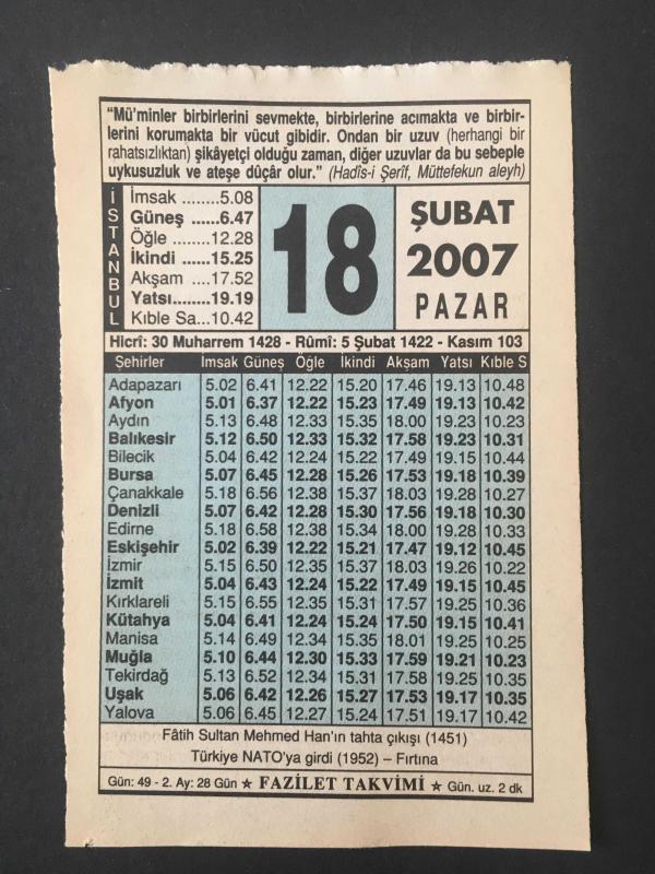 18 ŞUBAT 2007 -TAKVİM YAPRAĞI-DOĞUM GÜNÜ HEDİYESİ-FAZİLET TAKVİMİ,FATİHİN TAHTA ÇIKIŞI 1451,TÜRKİYE NATOYA GİRDİ 1952,İDARECİ NASIL OLMALI,SELEM PEŞİN PARA İLE VADELİ MAL ALMAK