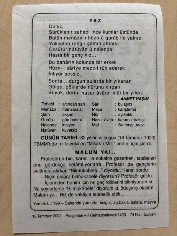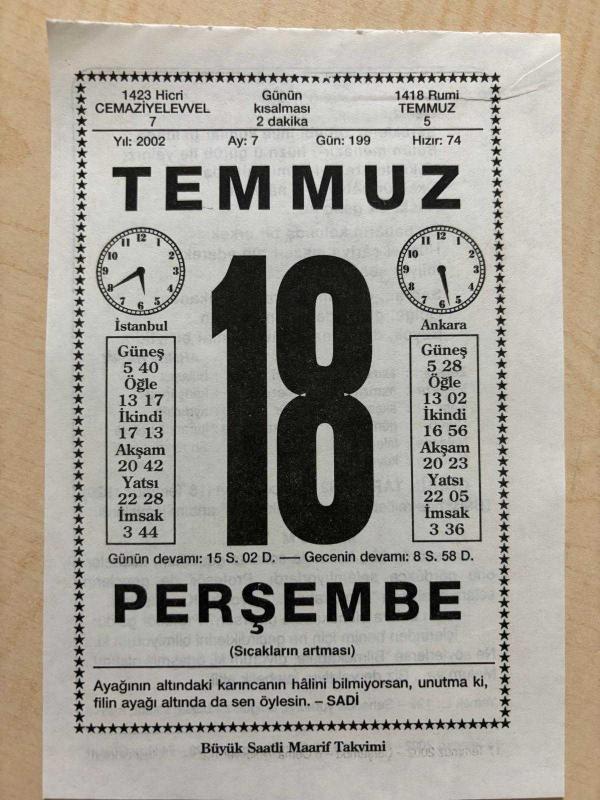 18 TEMMUZ 2002 - TAKVİM YAPRAĞI - DOĞUM GÜNÜ HEDİYESİ - BÜYÜK SAATLİ MAARİF TAKVİMİ - SADİ - AHMET HAŞİM - TBMM'DE MİSAK-I MİLLİ ANDI İÇİLDİ -MALUM YA ADLI YAZI, en son 8 ay önce güncellenmiştir.