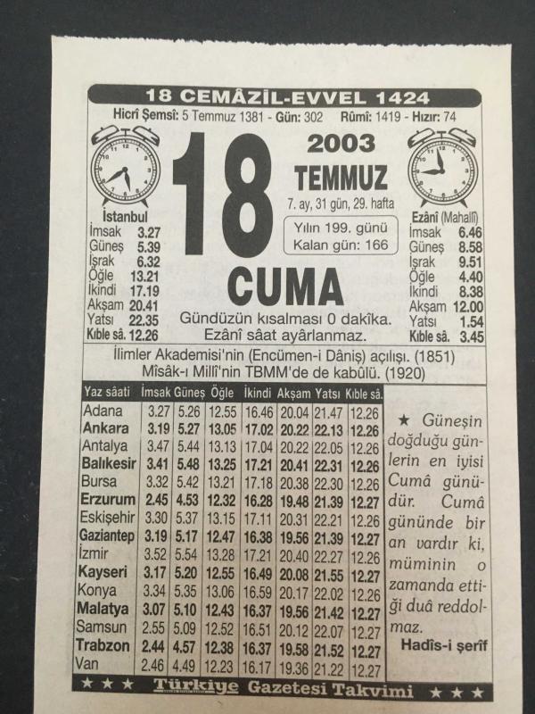 18 TEMMUZ 2003-TAKVİM YAPRAĞI-DOĞUM GÜNÜ HEDİYESİ-TÜRKİYE GAZETESİ TAKVİMİ,İLİMLER AKADEMESİNİN ENCÜMENİ DANİŞ AÇILIŞI 1851,MİSAK I MİLLİNİN TBMM DE KABULÜ,1920,YILDIRIM BAYEZIT HAN, en son 8 ay önce güncellenmiştir.