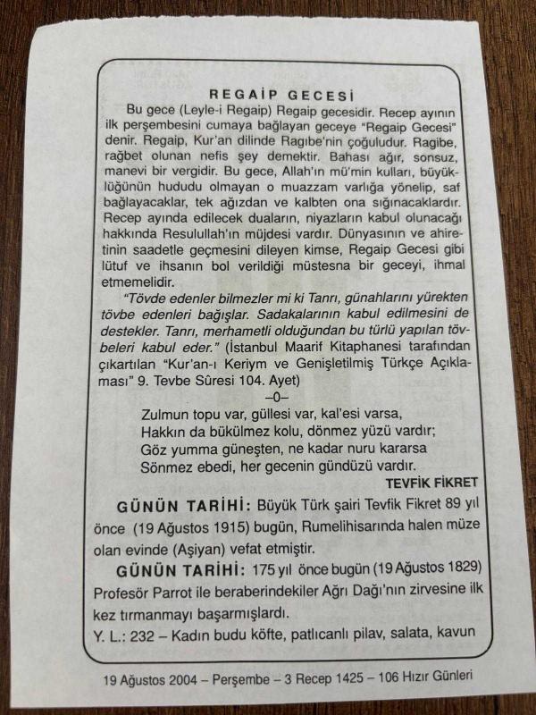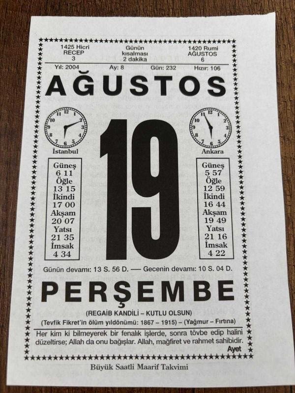 19 AĞUSTOS 2004 - TAKVİM YAPRAĞI - DOĞUM GÜNÜ HEDİYESİ - BÜYÜK SAATLİ MAARİF TAKVİMİ - AYET - TEVFİK FİKRET - FİKRET'İN VEFATI - PROF.PARROT İLE BERABERİNDEKİLER AĞRI DAĞINI TIRMANDI, en son 8 ay önce güncellenmiştir.