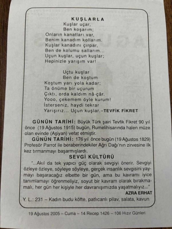 19 AĞUSTOS 2005 - TAKVİM YAPRAĞI - DOĞUM GÜNÜ HEDİYESİ - BÜYÜK SAATLİ MAARİF TAKVİMİ - TEVFİK FİKRET - FİKRET'İN VEFATI - PROF.PARROT İLE BERABERİNDEKİLER AĞRI DAĞINI TIRMANDI - AZRA ERHAT, en son 8 ay önce güncellenmiştir.