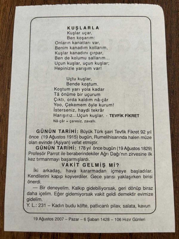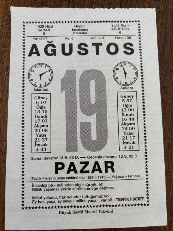 19 AĞUSTOS 2007 - TAKVİM YAPRAĞI - DOĞUM GÜNÜ HEDİYESİ - BÜYÜK SAATLİ MAARİF TAKVİMİ - TEVFİK FİKRET - TEVFİK FİKRET'İN VEFATI - PROF.PARROT İLE BERABERİNDEKİLER AĞRI DAĞINI TIRMANDI, en son 8 ay önce güncellenmiştir.