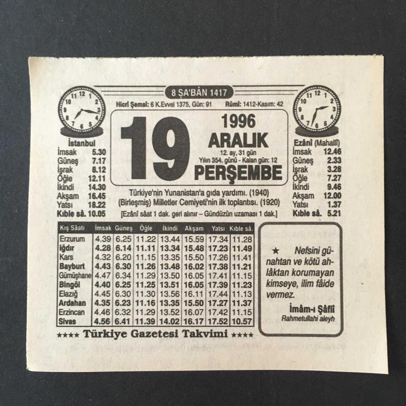 19 ARALIK 1996 -TAKVİM YAPRAĞI-DOĞUM GÜNÜ HEDİYESİ-TÜRKİYE GAZETESİ TAKVİMİ,TÜRKİYENİN YUNANİSTANA GIDA YARDIMI,1940,MİLLETLER CEMİYETİNİN İLK TOPLANTISI 1920,HASETÇİNİN SONU,ANTİBİYOTİK başlıklı ürün, Efemera, Müzik, Sinema > Belge ve Evraklar > Takvimler kategorisi altında İkinci El olarak satılmaktadır.