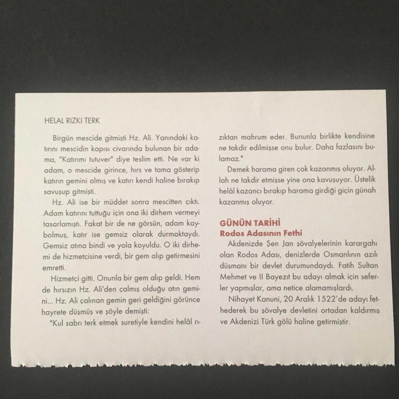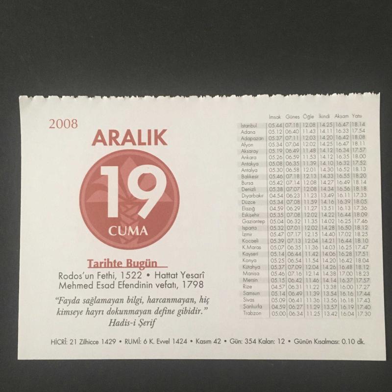 19 ARALIK 2008 -TAKVİM YAPRAĞI-DOĞUM GÜNÜ HEDİYESİ-KUVEYT TÜRK TAKVİMİ,RODOSUN FETHİ,1522,HATTAT YESARİ MEHMED ESAD EFENDİNİN VEFATI 1798,HALAL RIZKI TERK,GÜNÜN TARİHİ RODOS ADASININ FETHİ, 1 yıl önce satışa sunulmuştur.