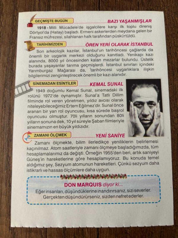 19 ARALIK 2020 - TAKVİM YAPRAĞI - DOĞUM GÜNÜ HEDİYESİ - BÜYÜK SAATLİ MAARİF TAKVİMİ - Slovenya'nın başkenti Ljubljana -1918 - Milli Mücadele'de işgalcilere karşı ilk toplu direniş Dörtyol'da (Hatay) başladı -ÖREN YERİ OLARAK İSTANBUL - KEMAL SUNAL - DON MARQUIS başlıklı ürün, Efemera, Müzik, Sinema > Belge ve Evraklar > Takvimler kategorisi altında İkinci El olarak satılmaktadır.