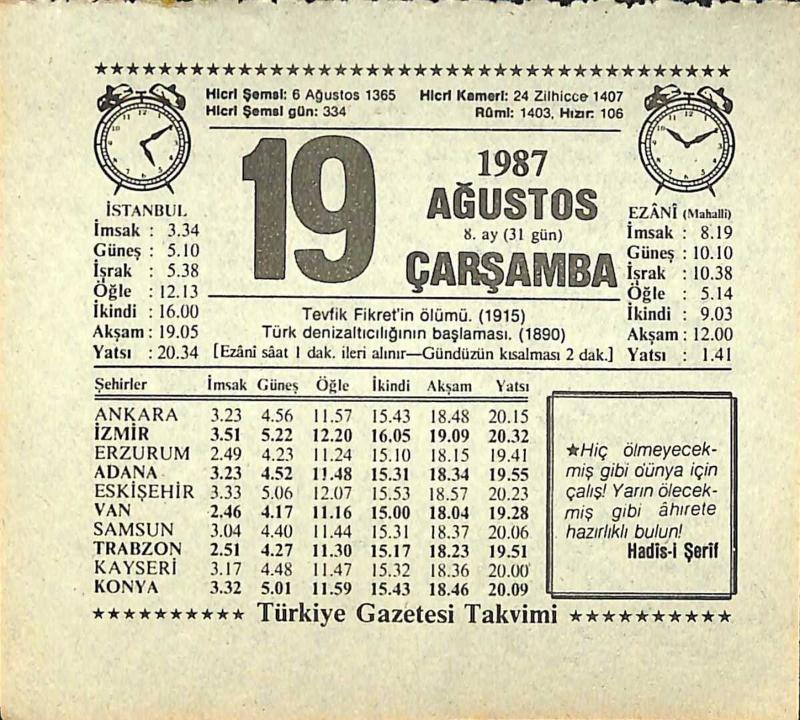 19 Ağustos 1987 Takvim Yaprağı - Doğum Günü Hediyesi EFMN13862, en son 21 gün önce güncellenmiştir.